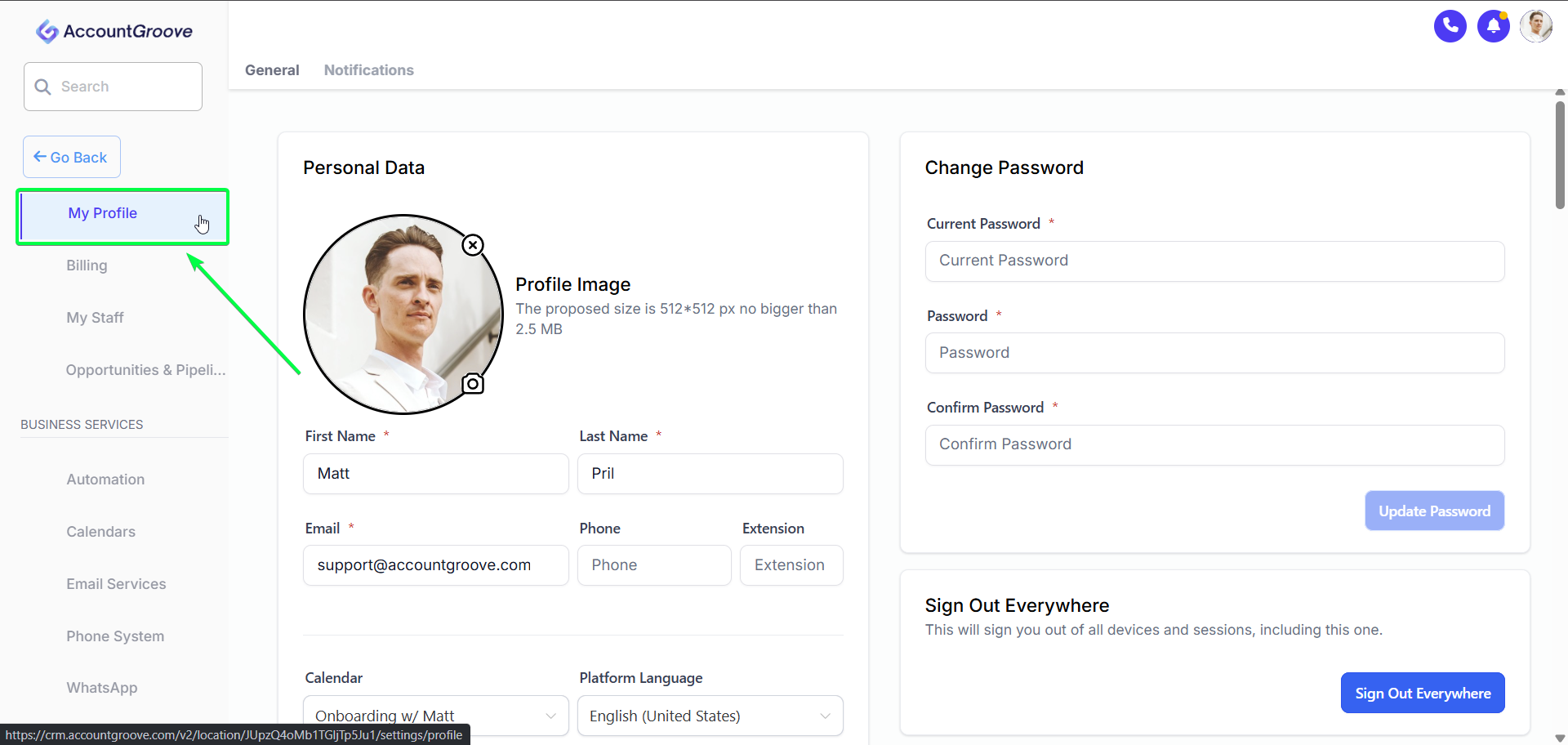 Personal settings allow you to customize your profile, email signature, calendar connections, and availability inside AccountGroove to be reflected across the platform