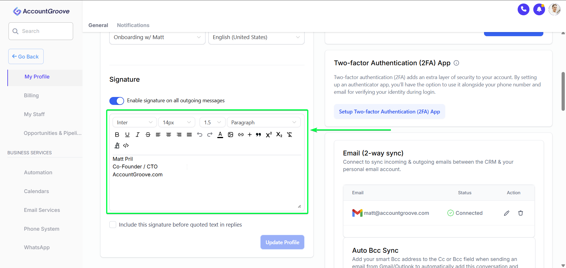 Note: By enabling the toggle your signature will automatically appear on emails sent from AccountGroove.