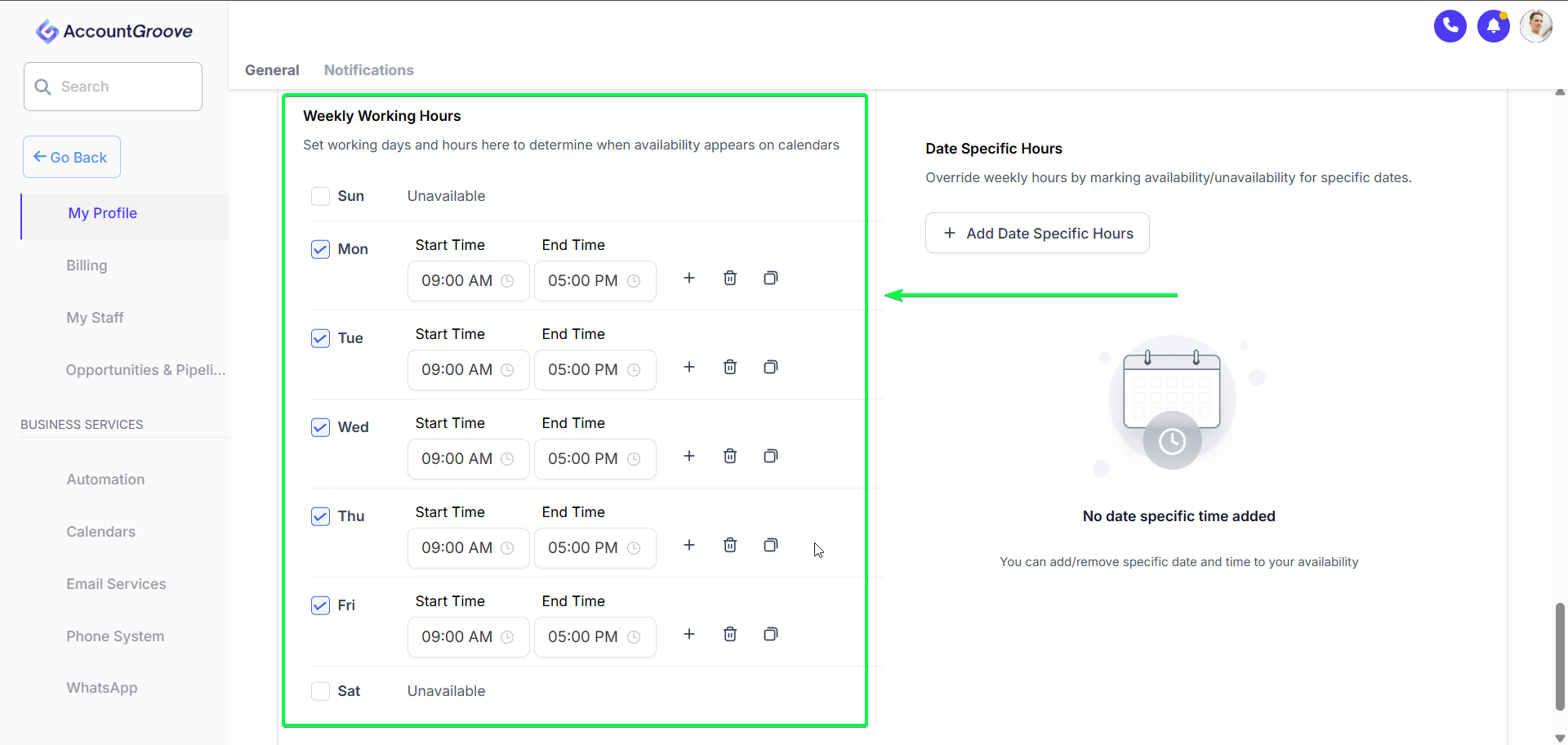 - In My Profile, scroll to Working Hours