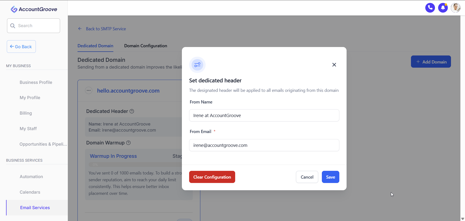 Once saved, all future emails sent from AccountGroove will use these settings.