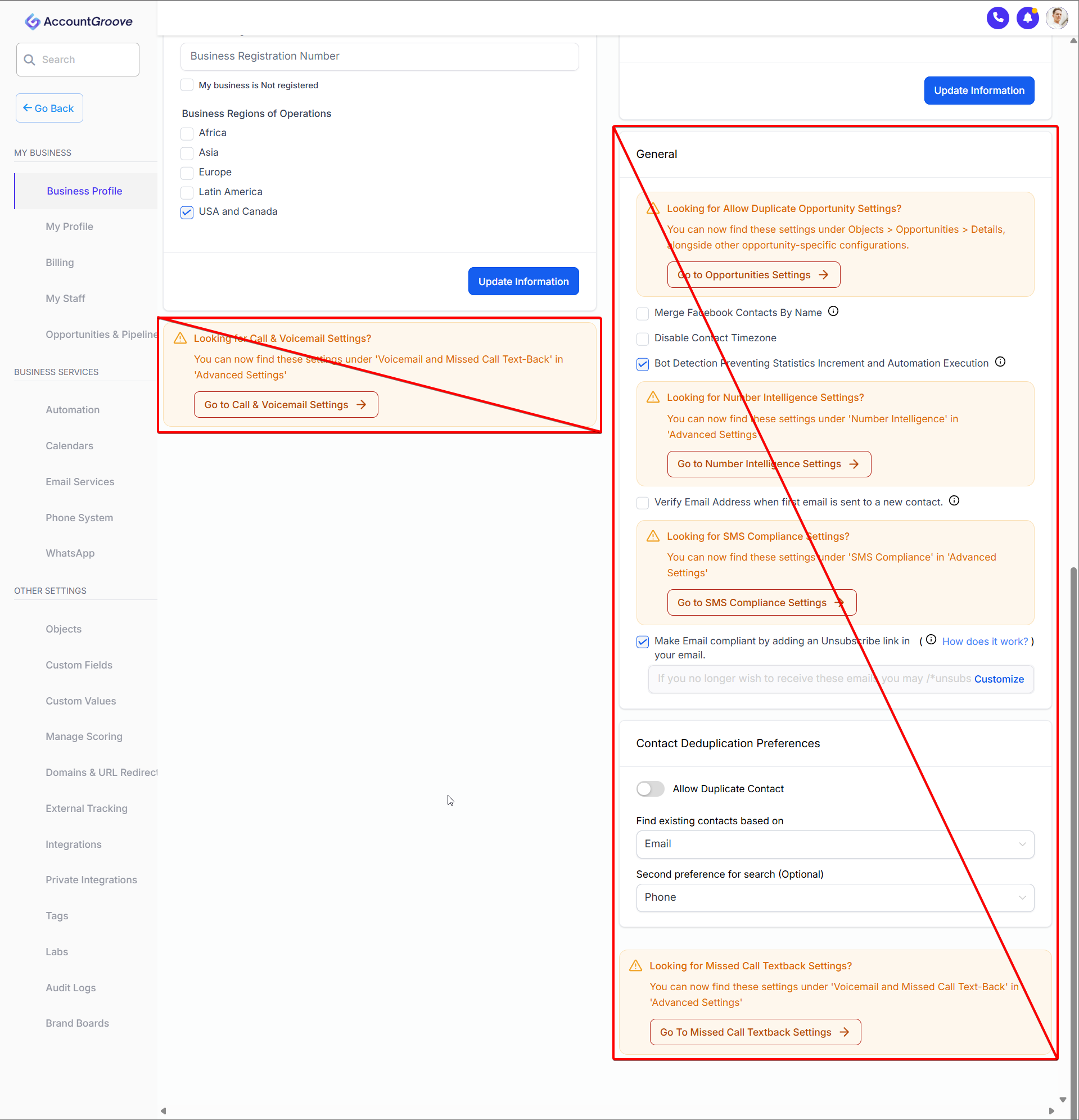 Some settings shown in the Business Profile are not required for AccountGroove to function properly at this stage.