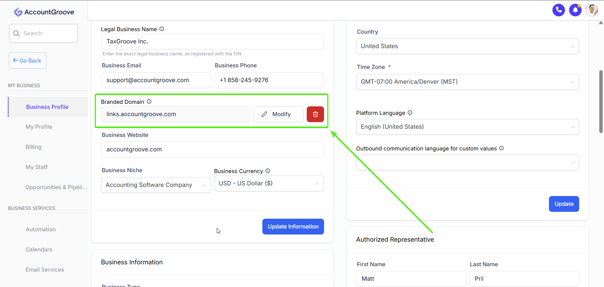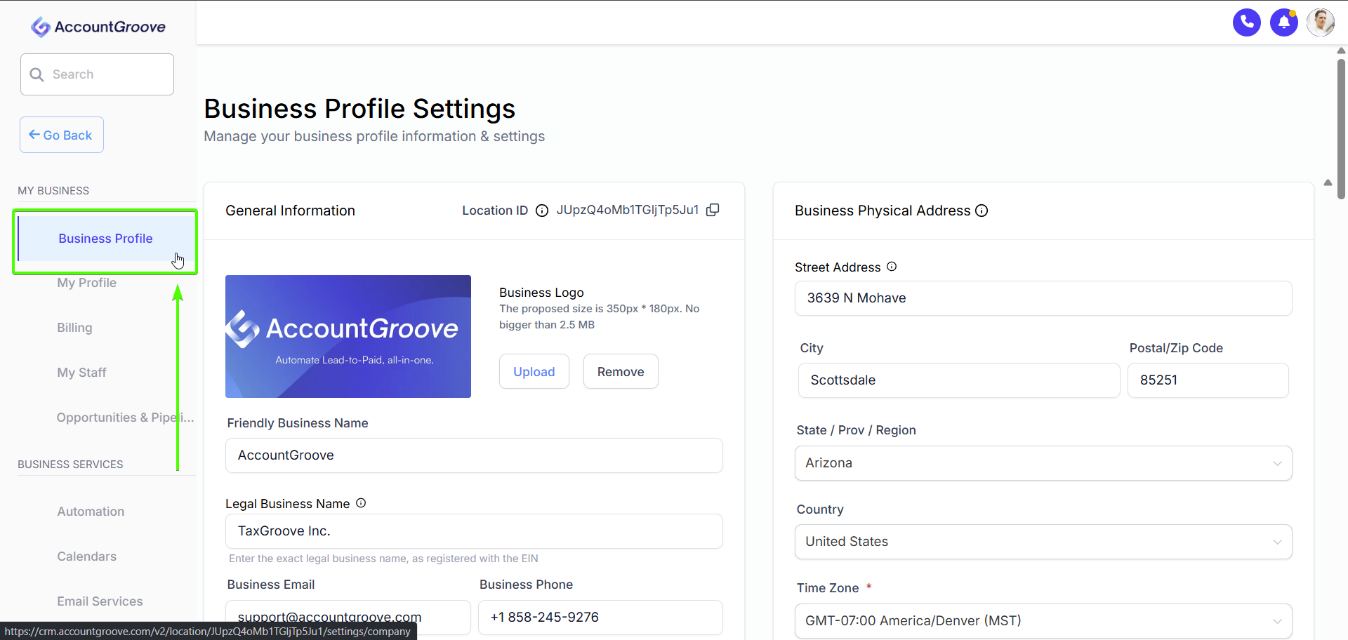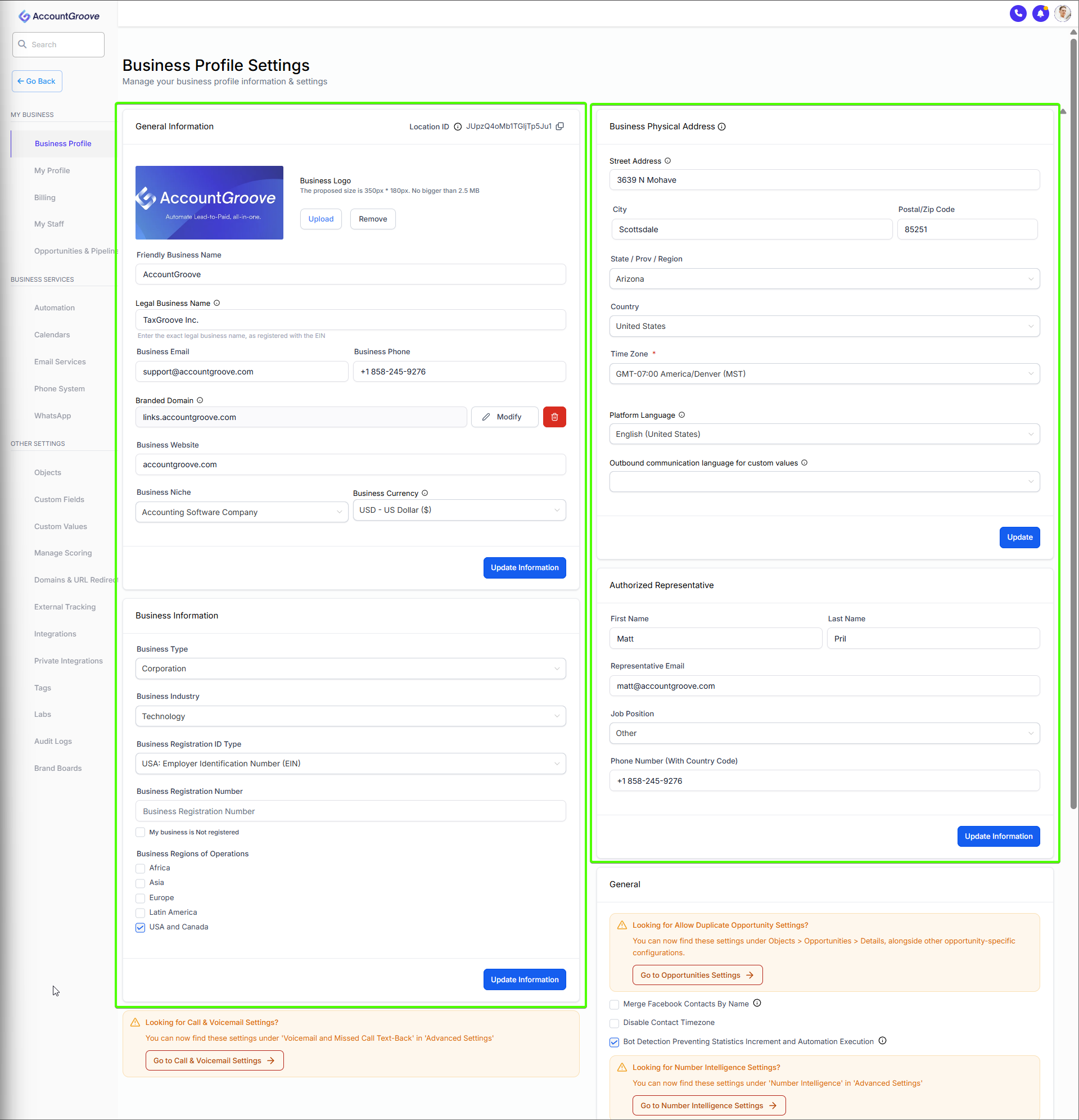 Business settings control how your company appears in AccountGroove and are used for compliance, communication verification, and system configuration. It’s important that this information is entered accurately.