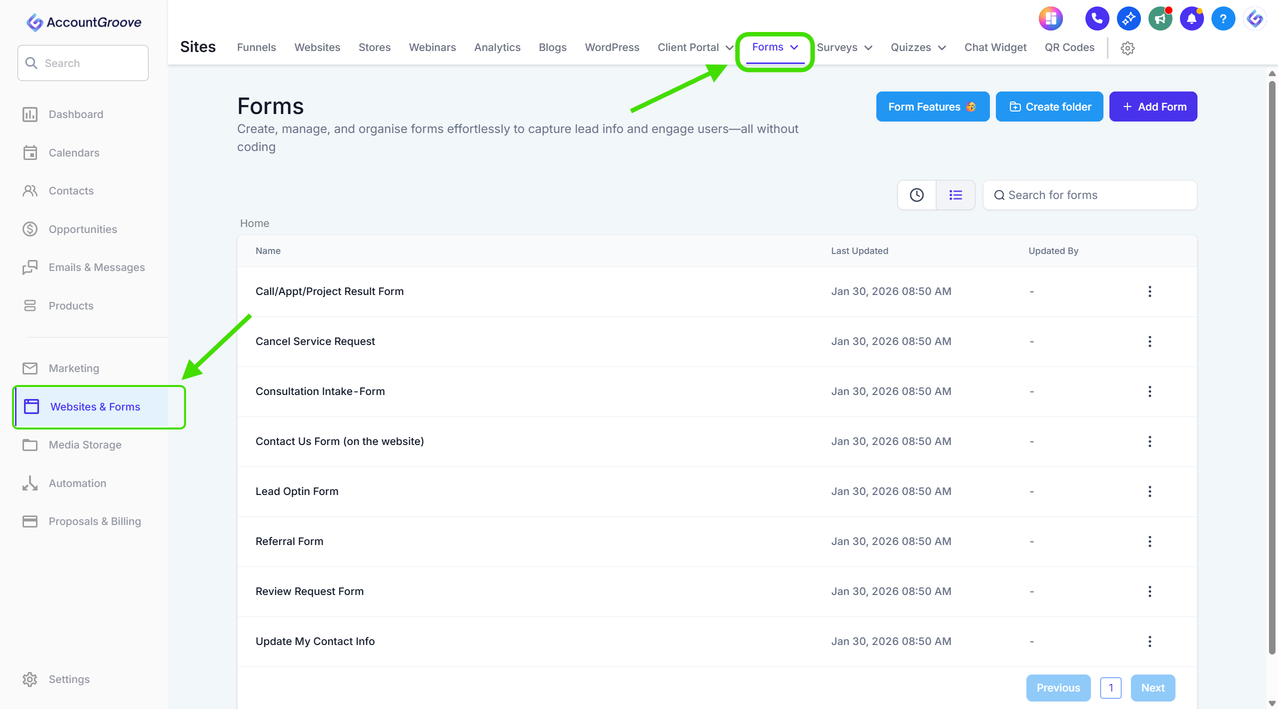- Navigate to Websites → Forms