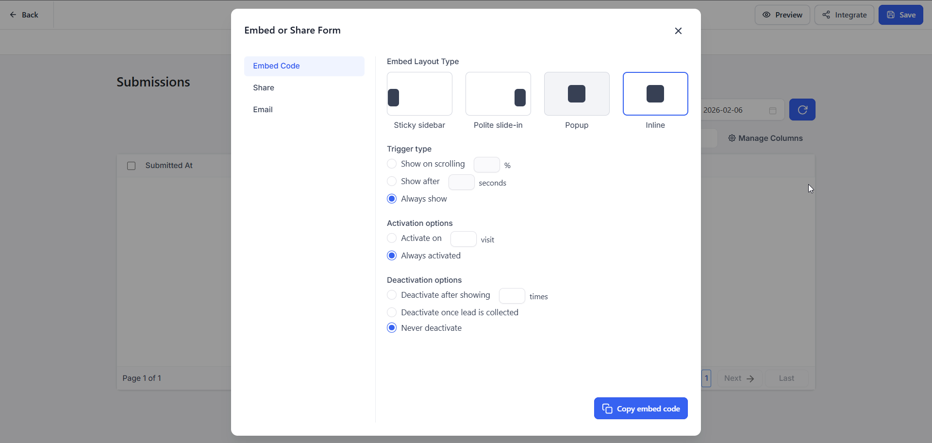 If you want the form to appear as a pop-up, you can configure trigger types such as: