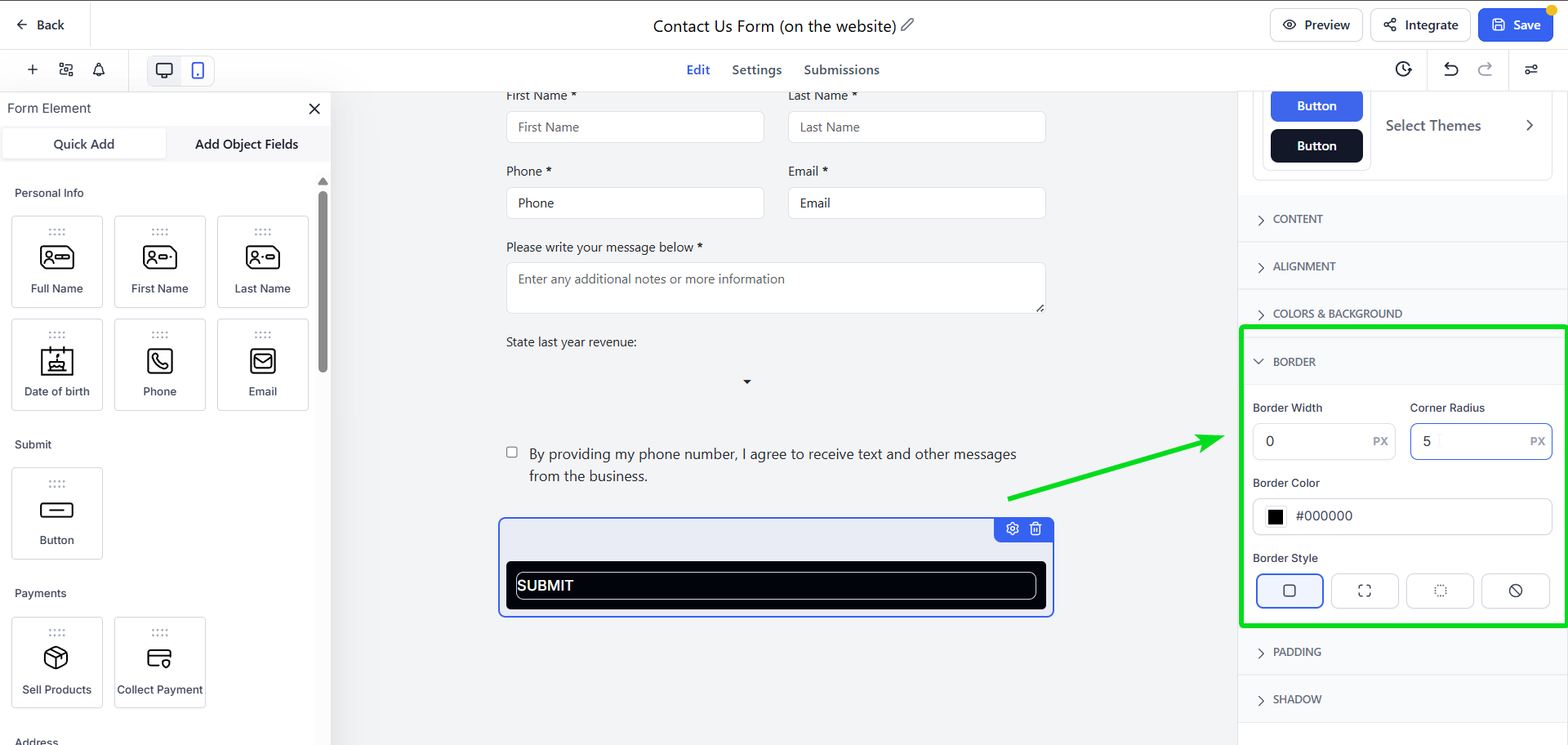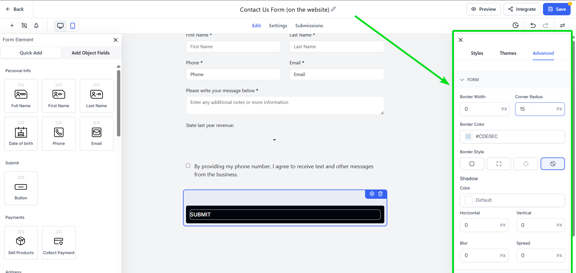 - Form: Adjust the form container’s borders, corners, and shadow