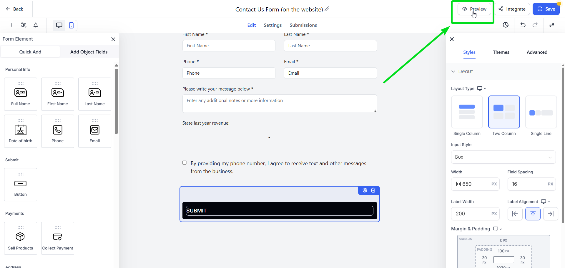 Note: You may need to click on Preview to see the style updates you have made to you form:
