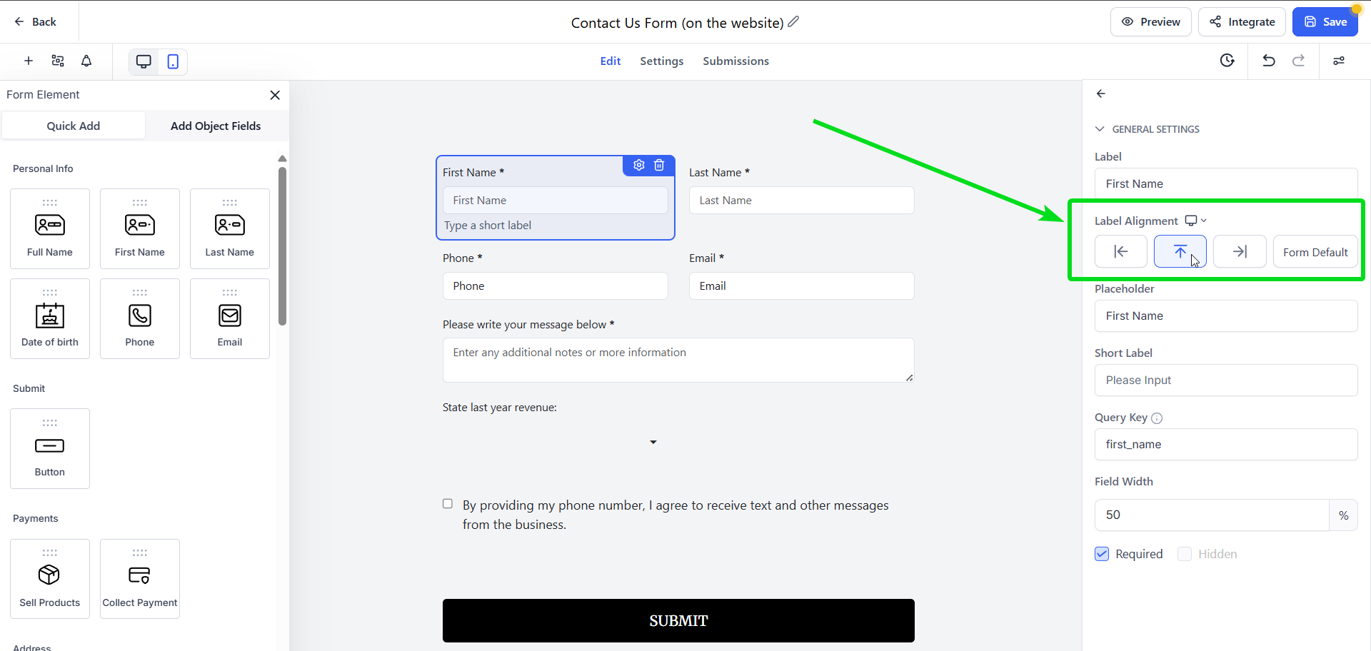 - From here, select the desired label alignment for that element using the Arrows (Top, Left, Right or Form Default)