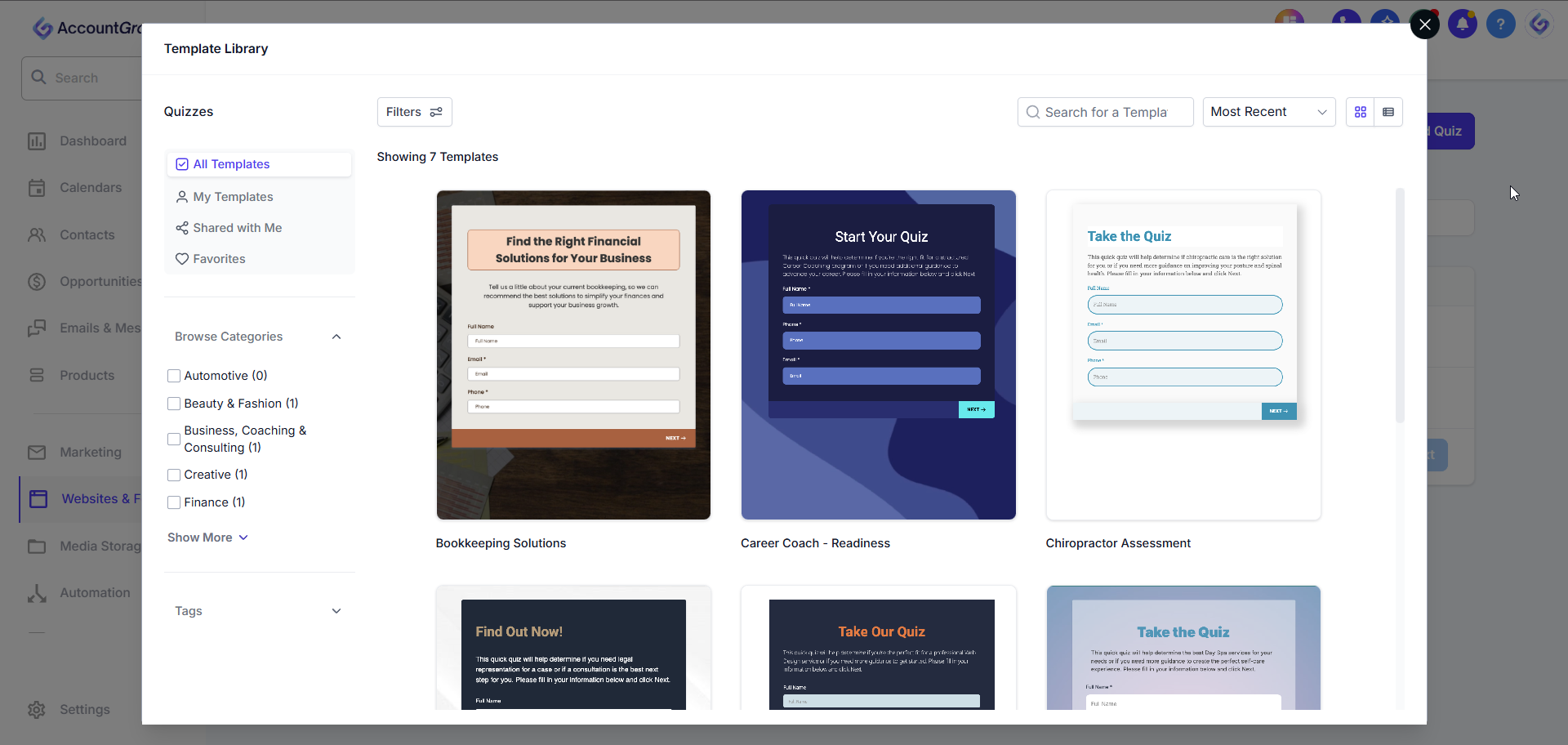 Start From Templates. In the Template Library you can browse, filter, and search for a template. Preview and activate one to load it into the Quiz Builder.