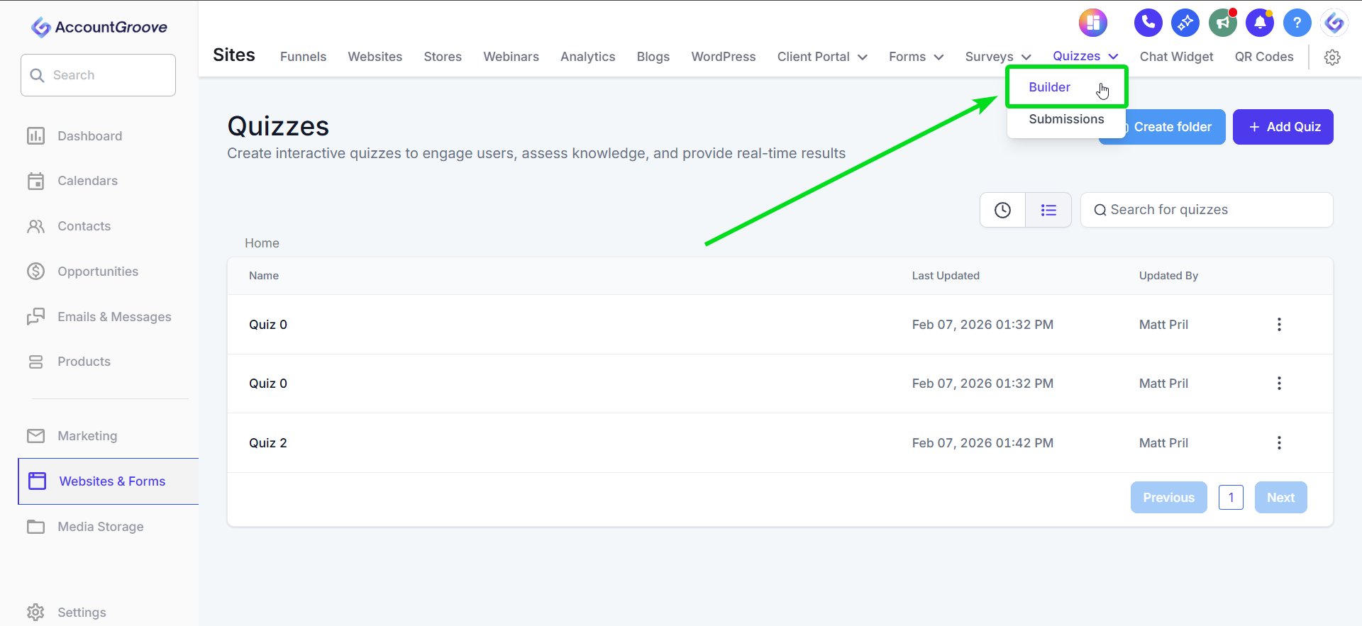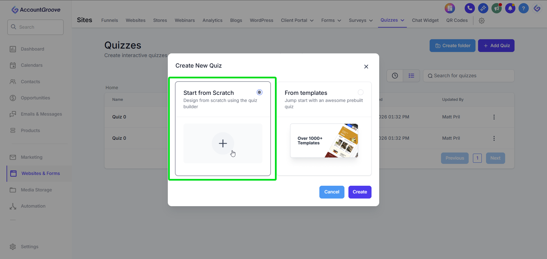 Click on + Add Quiz > Start From Scratch > Create to go directly to a blank Quiz Builder OR start From Templates > Create.