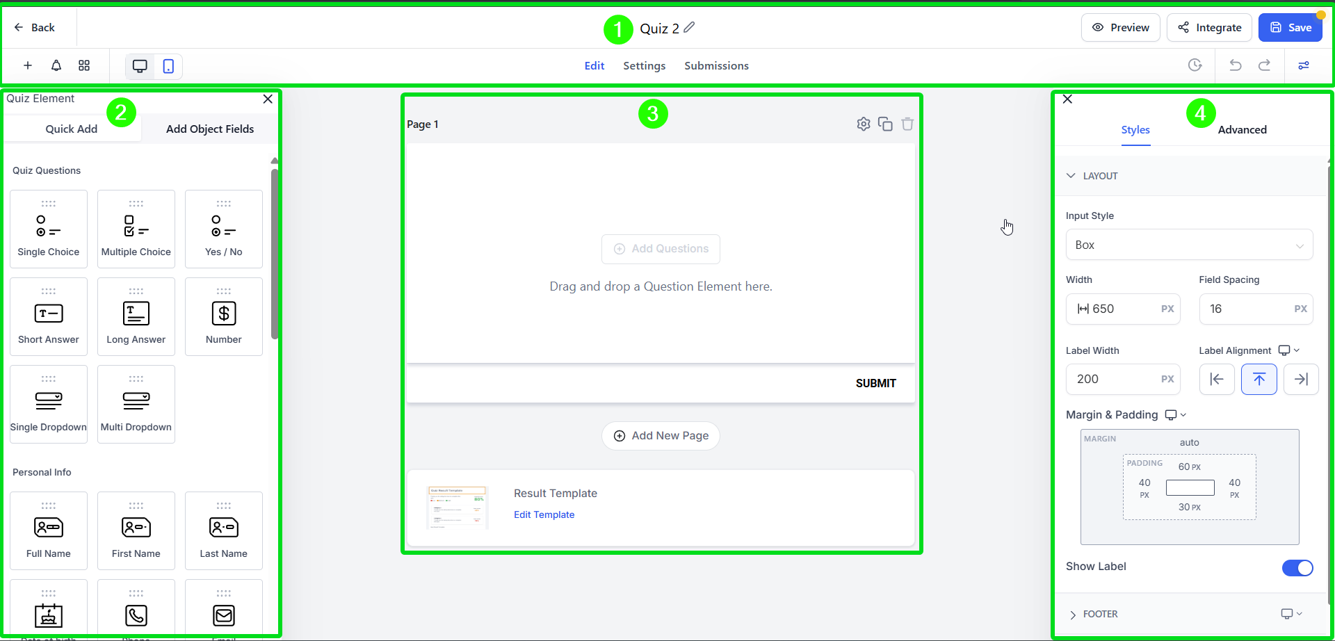 Right Panel: Here you will find the settings for the Quiz or for the currently selected Element.