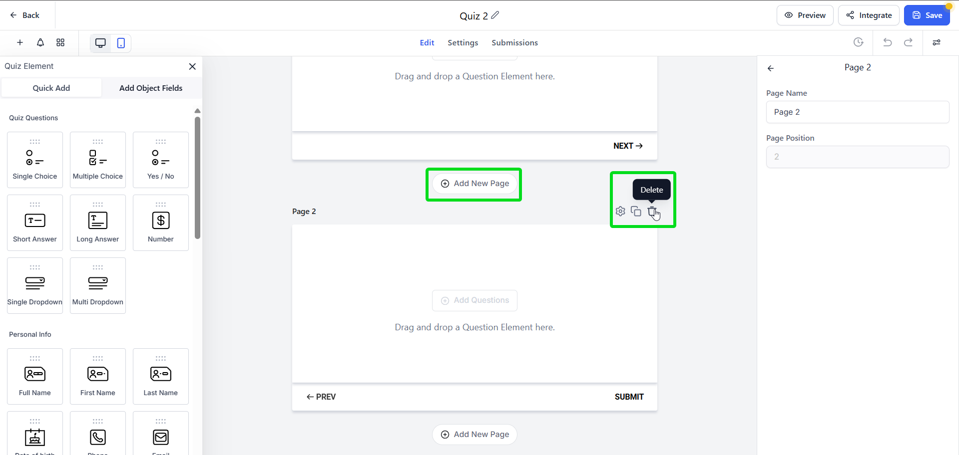 Add and Delete Elements. Elements must be added to a Page. Elements can be dragged and dropped to reorder them inside a Page or to move them to a different Page.