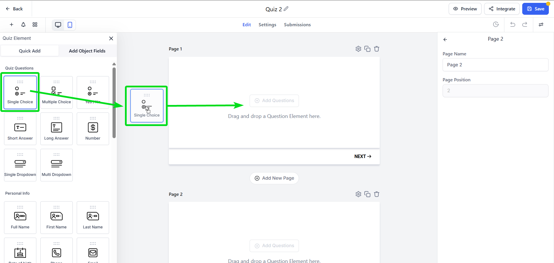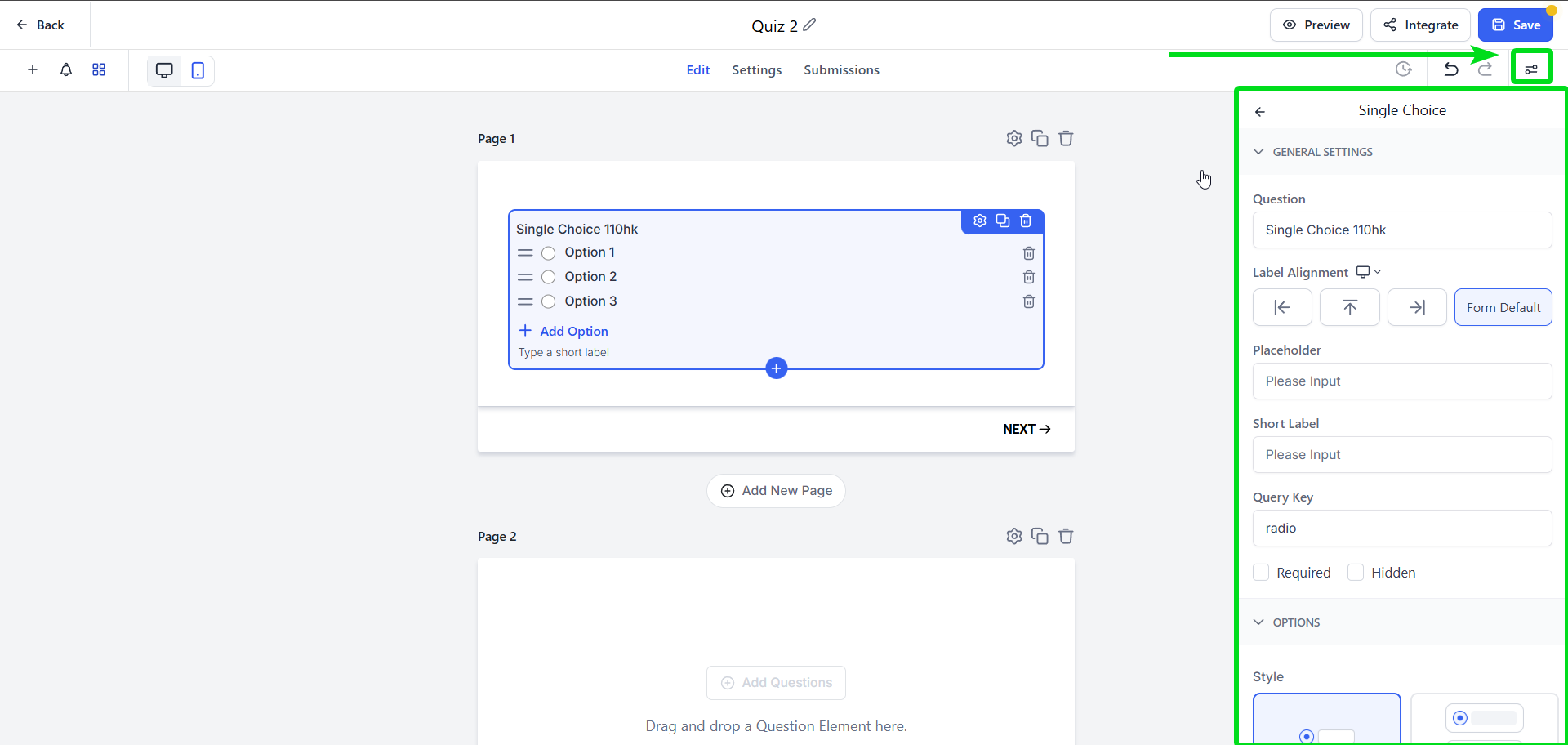 Once you've saved your quiz, click the Integrate button in the top-right corner.