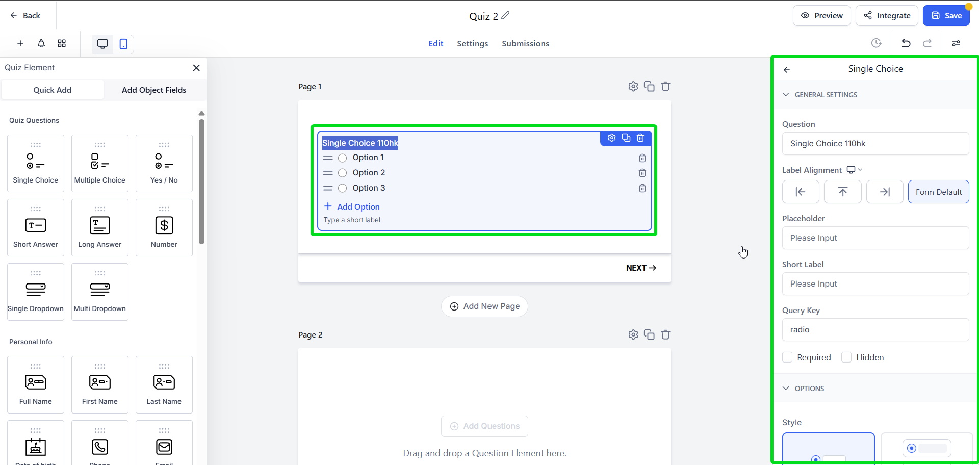 Edit Elements. Click an Element to highlight it and also open its settings in the Right Panel. Generally the Element will have a Question (the question shown to the Quiz user) and other standard settings like the Query Key (to prefill the question from a URL parameter and Required or Hidden. Each Element also has unique settings (ex: choice questions have Options which also allow Jump To branching logic).