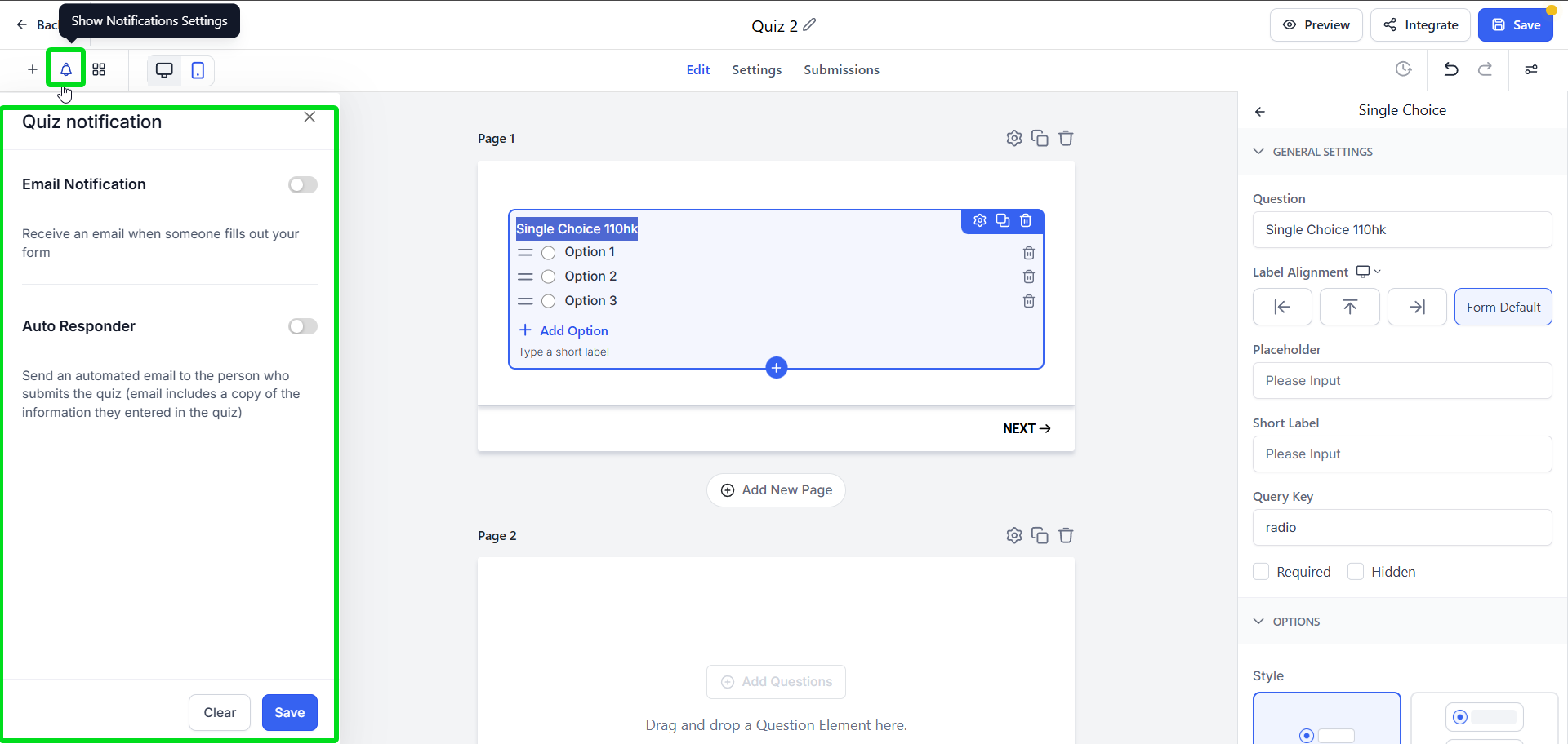 Notifications: Click the Bell icon to show in the Left Panel. Toggle your personal Email Notification and an Auto Responder for the quiz user. You can set Subject, Email To, Reply To, and Sender Name.