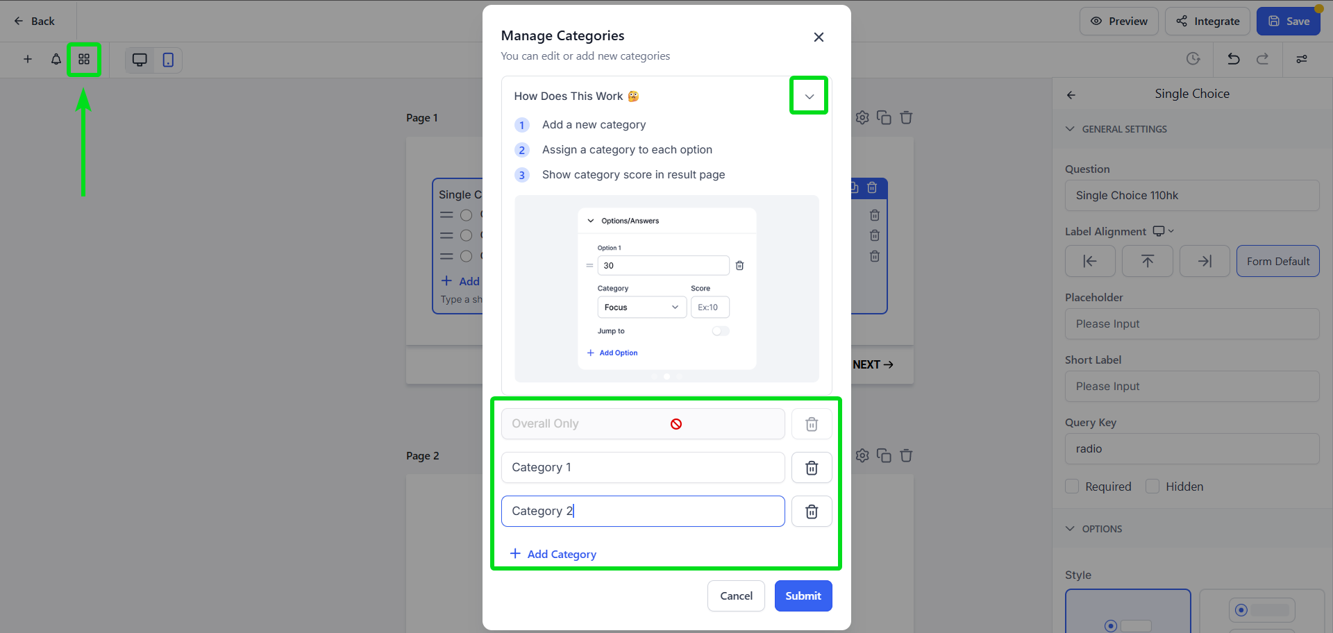 Categories: Click the Grid icon to open the category popover. From here, you can add, rename, and delete categories, then assign categories and scores to answer options. The popover also explains how categories flow into the Result Page, so you understand how category scores will display.