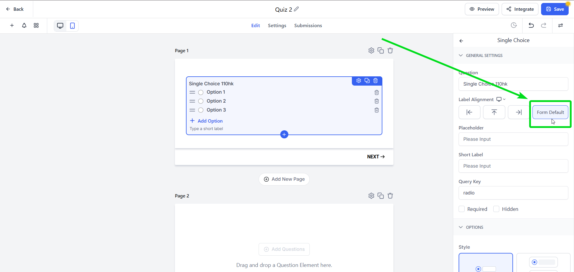 Element-Level Label Alignment: Element-level label alignment lets you set a different label position for each field, instead of applying one global alignment to the entire quiz. Use it to fineātune visual rhythm and spacing, especially in compact layouts. To set element-level label alignment, first select a question. In the right sidebar, use the selector Arrows under Label Alignment to define your choice. Keep in mind that on mobile, alignment automatically defaults to Top, ensuring a clear, user-friendly layout regardless of desktop settings