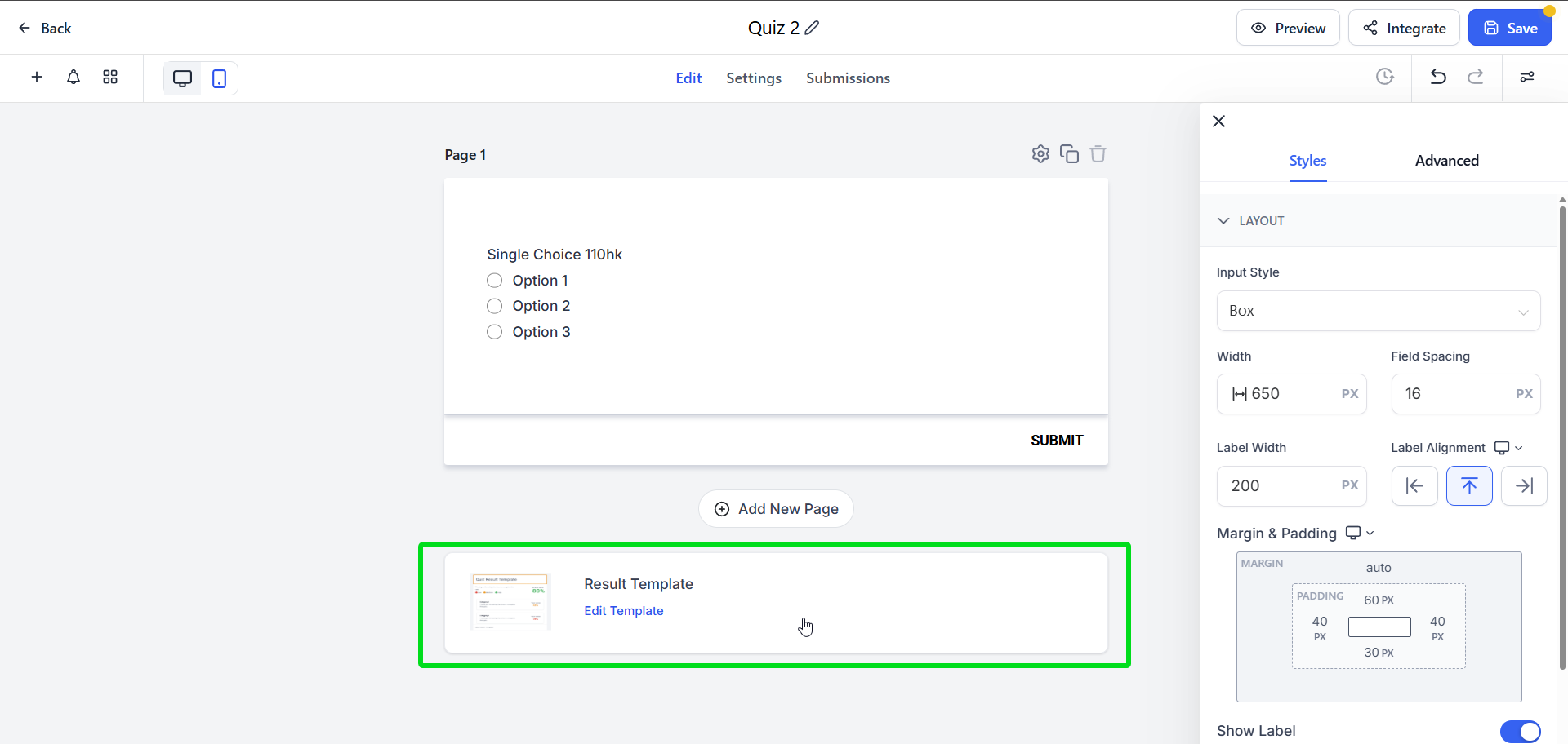 After the user submits the quiz, they are taken to a results page. In the main quiz builder, scroll to the bottom and click Edit Template under "Result Template."