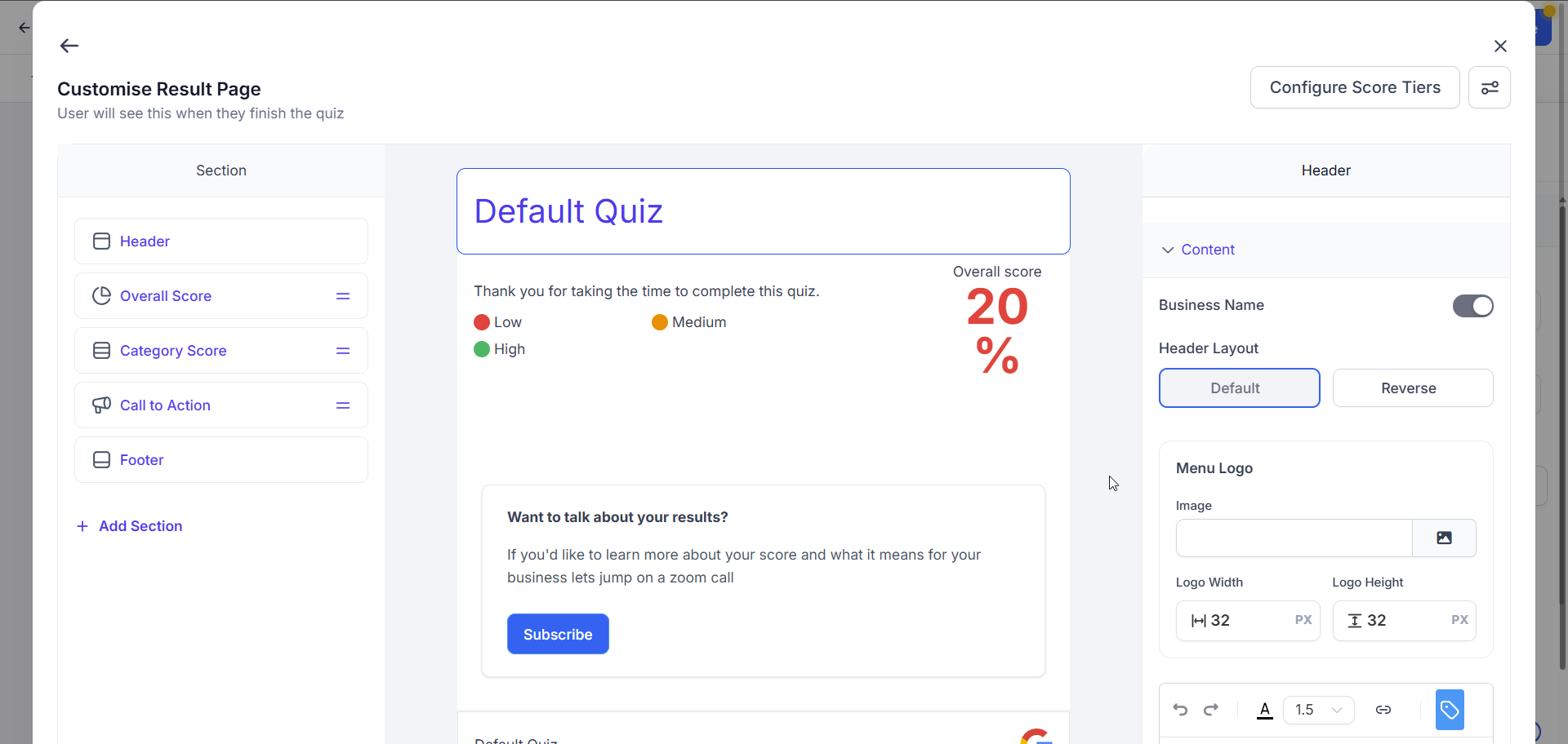 Configure Scores: The results are based on dynamic content. You can edit the text displayed for each score tier (e.g., Low, Medium, High).