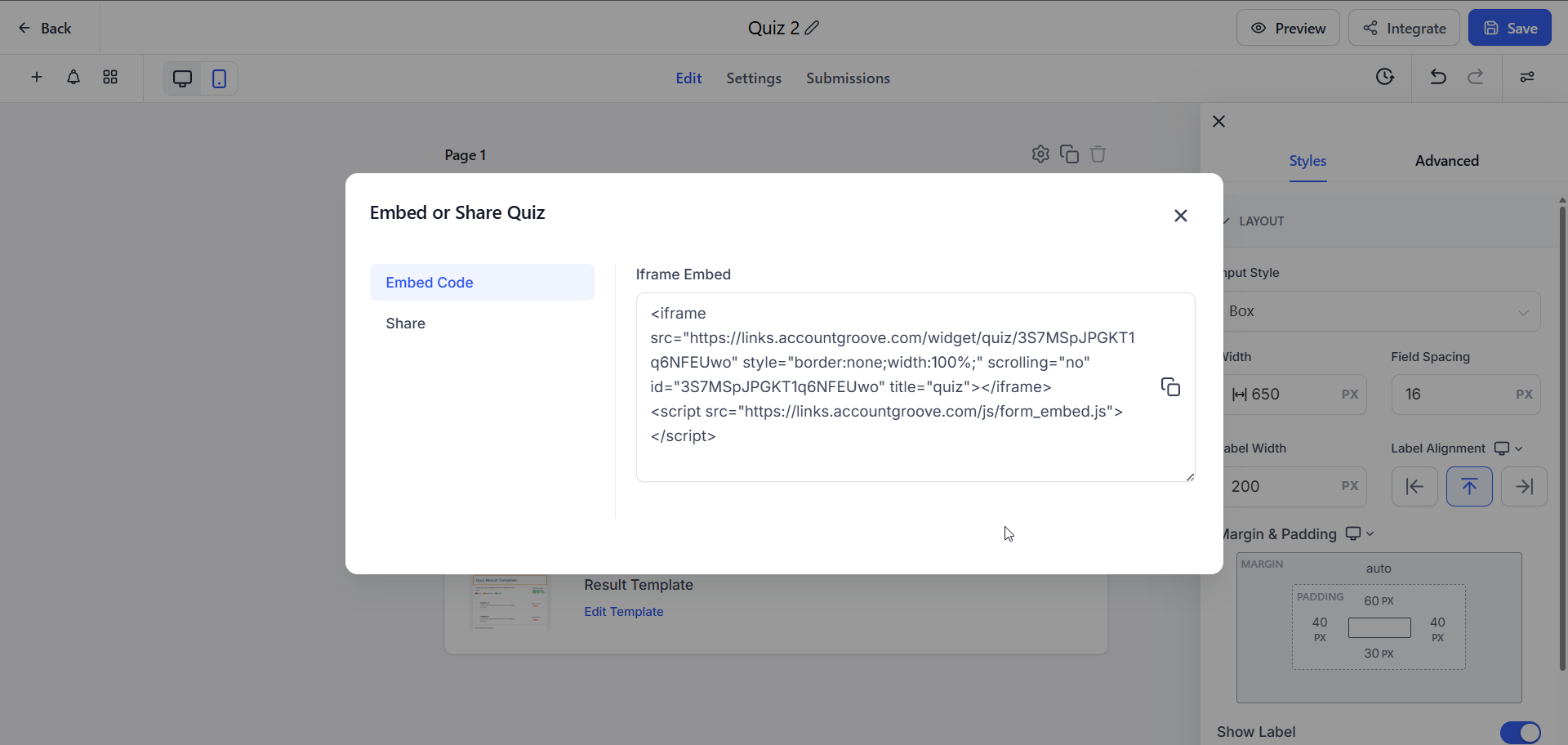 Embed: Copy the i-frame code to embed the quiz directly onto your website or funnel pages.